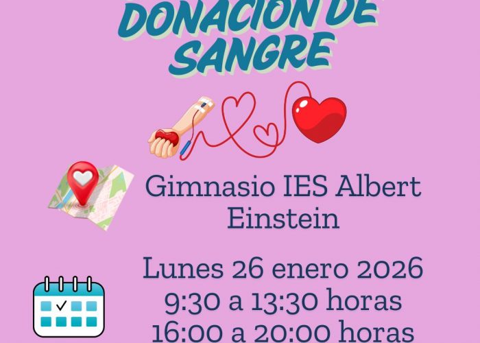 EL LUNES 26 DE ENERO en horario de 9:30 a 13:30 horas y de 16:00 a 20:00 horas habrá una campaña de donación de sangre en el gimnasio del I.E.S. ALBERT EINSTEIN.